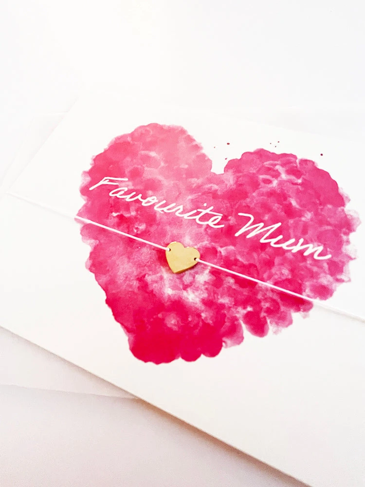 Die perfekte Karte für jede Lieblingsmama. Karte mit einem Herz als 18K vergoldeter Anhänger an einem rosafarbenen Armband.